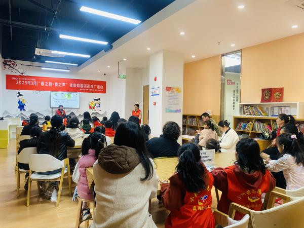 紧接着,活动进入“认识春天的节气”环节,工作人员重点介绍了当下的春分节气。从春分的由来、习俗到气候特点,工作人员娓娓道来,并结合生动形象的图片和视频,让读者们对春分节气有了更深入的了解。通过对节气的解读,读者们不仅感受到了传统文化的魅力,也对春天的自然规律有了更清晰的认识。在随后的环节中,志愿者精心挑选了《惠崇春江晚景》《江南春》等经典古诗,带领小读者们一起朗诵,还科普了展子虔的《游春图》、袁耀的《汉宫春晓图》莫奈的《春天的花》等经典画作,以多元化的形式向读者展现春天的丰富内涵。